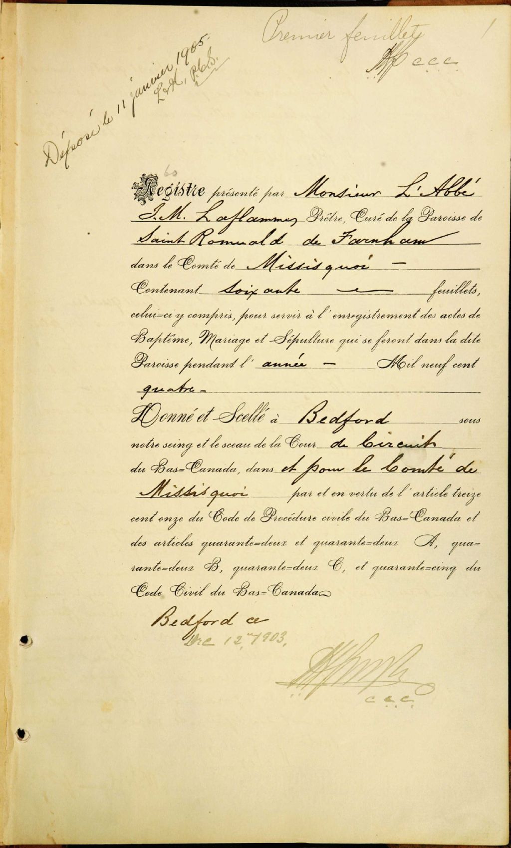 Saint-Romuald-de-Farnham, 1900-1921, Archives nationales à Montréal, Fonds Cour supérieure. District judiciaire de Bedford. État civil, (06M,CE611,S10).