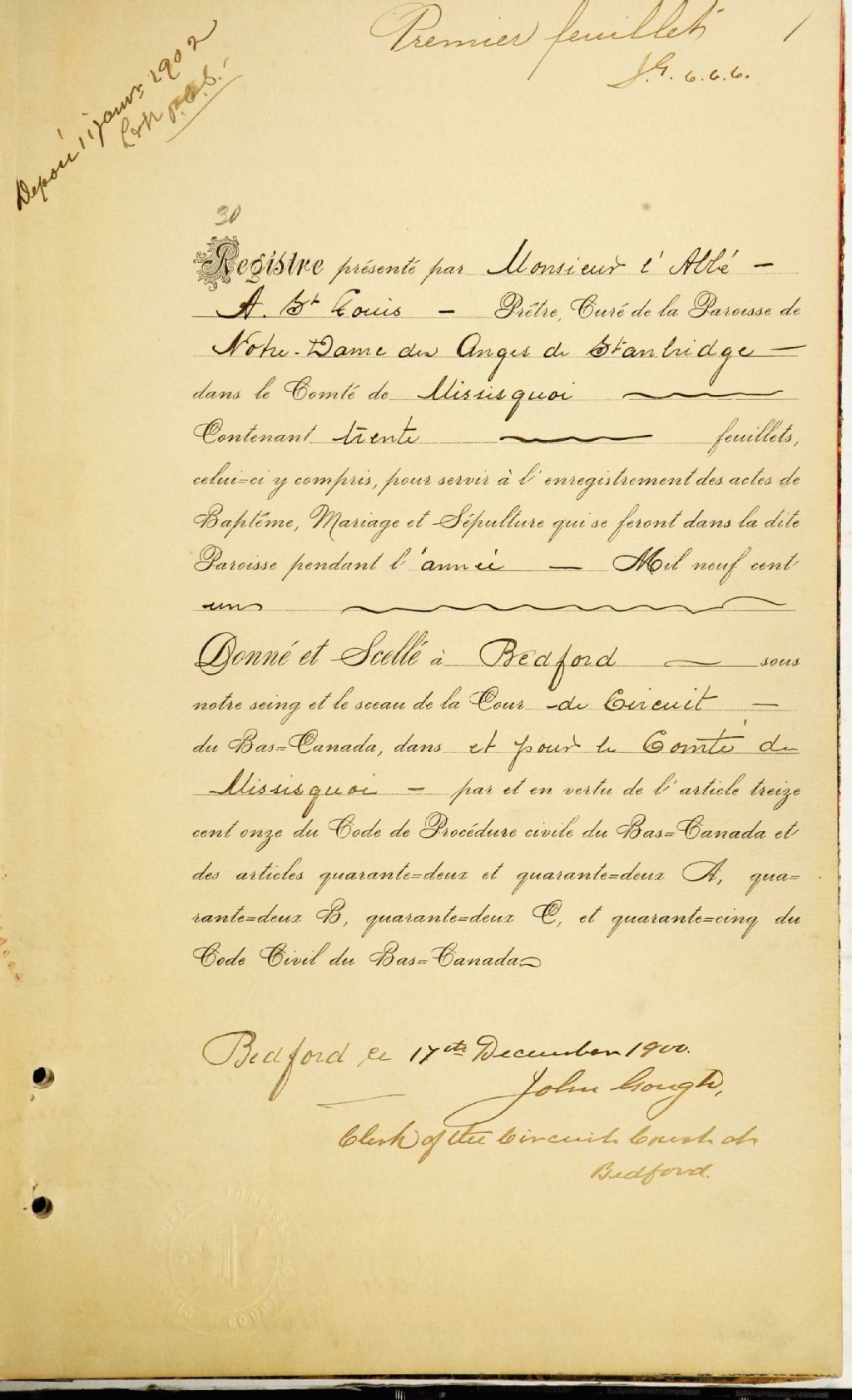 Notre-Dame-des-Anges-de-Stanbridge, 1900-1921, Archives nationales à Montréal, Fonds Cour supérieure. District judiciaire de Bedford. État civil, (06M,CE611,S26).