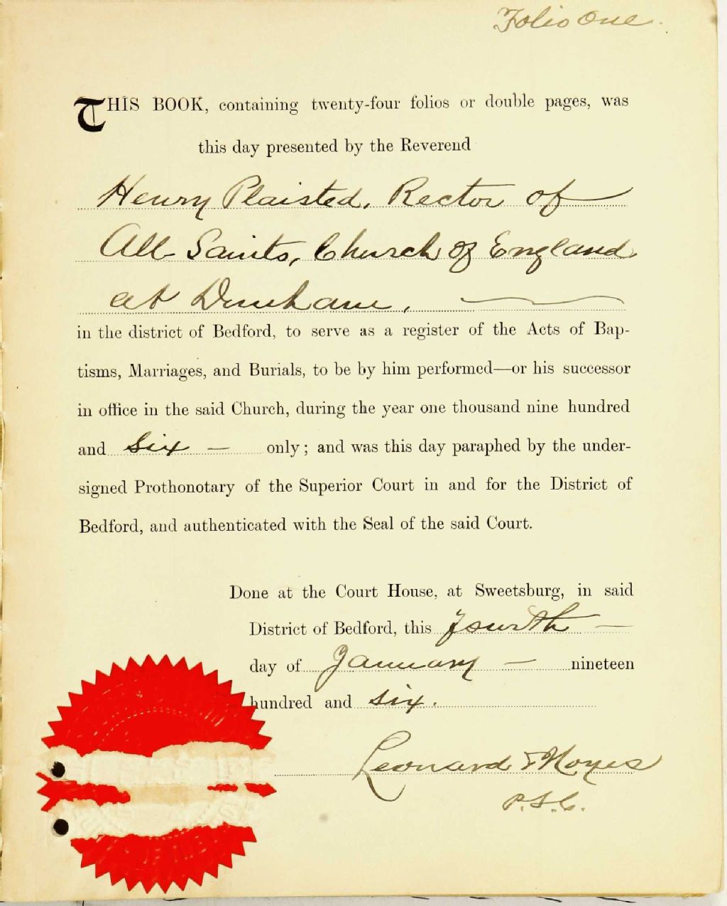 All Saints Anglican Church, 1900-1921, Archives nationales à Montréal, Fonds Cour supérieure. District judiciaire de Bedford. État civil, (06M,CE611,S38).