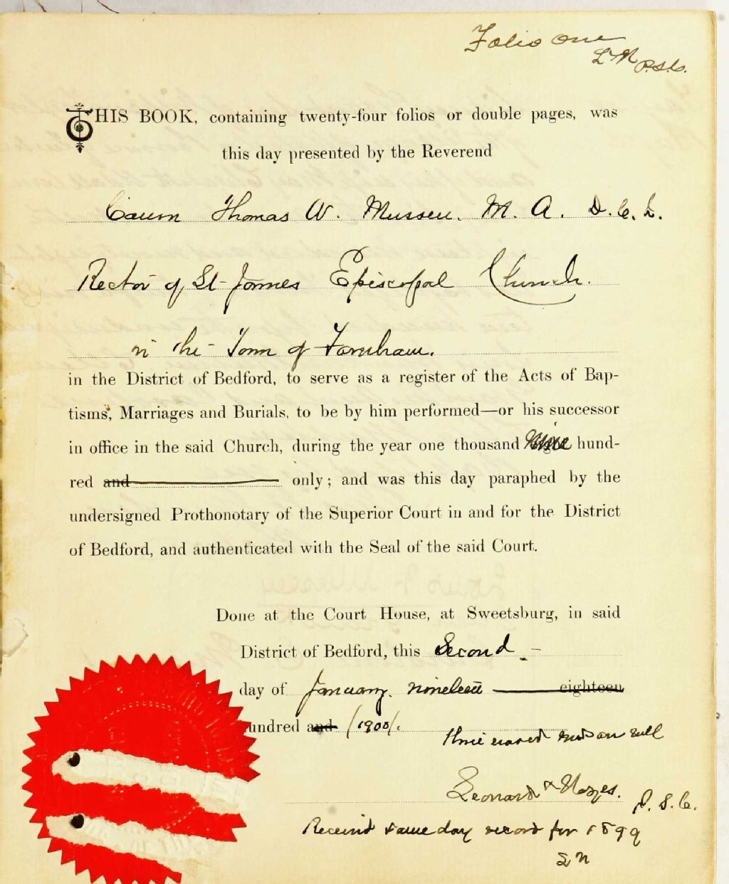 St. James The Apostle Anglican Church of Bedford, 1900-1921, Archives nationales à Montréal, Fonds Cour supérieure. District judiciaire de Bedford. État civil, (06M,CE611,S39).