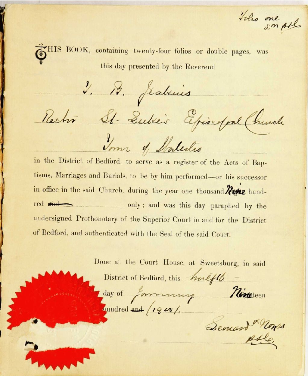 St. Luke's Anglican Church, 1900-1921, Archives nationales à Montréal, Fonds Cour supérieure. District judiciaire de Bedford. État civil, (06M,CE611,S50).