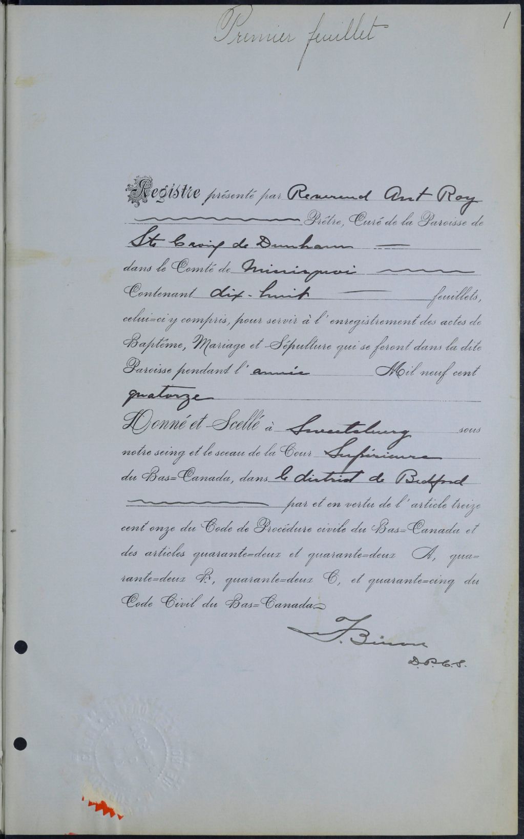 Sainte-Croix-de-Dunham, 1900-1921, Archives nationales à Montréal, Fonds Cour supérieure. District judiciaire de Bedford. État civil, (06M,CE611,S8).