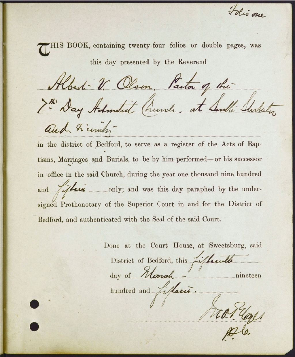 Abercorn 7th Day Adventist Church, 1915-1918, Archives nationales à Montréal, Fonds Cour supérieure. District judiciaire de Bedford. État civil, (06M,CE611,S84).