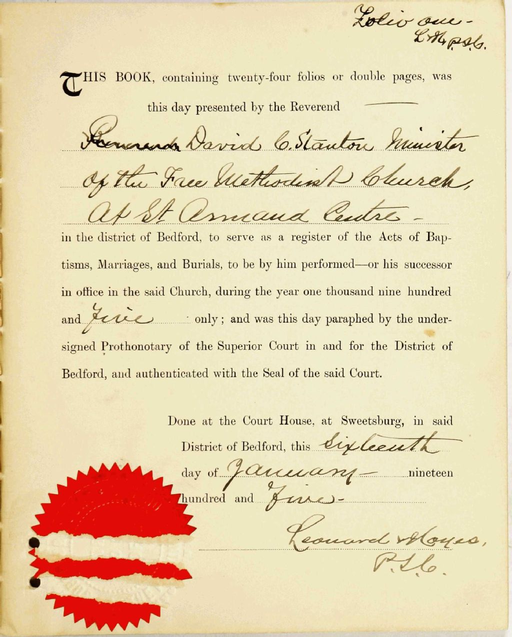 Saint-Armand Centre Free Methodist Church, 1905-1906, 1912-1913, Archives nationales à Montréal, Fonds Cour supérieure. District judiciaire de Bedford. État civil, (06M,CE611,S86).