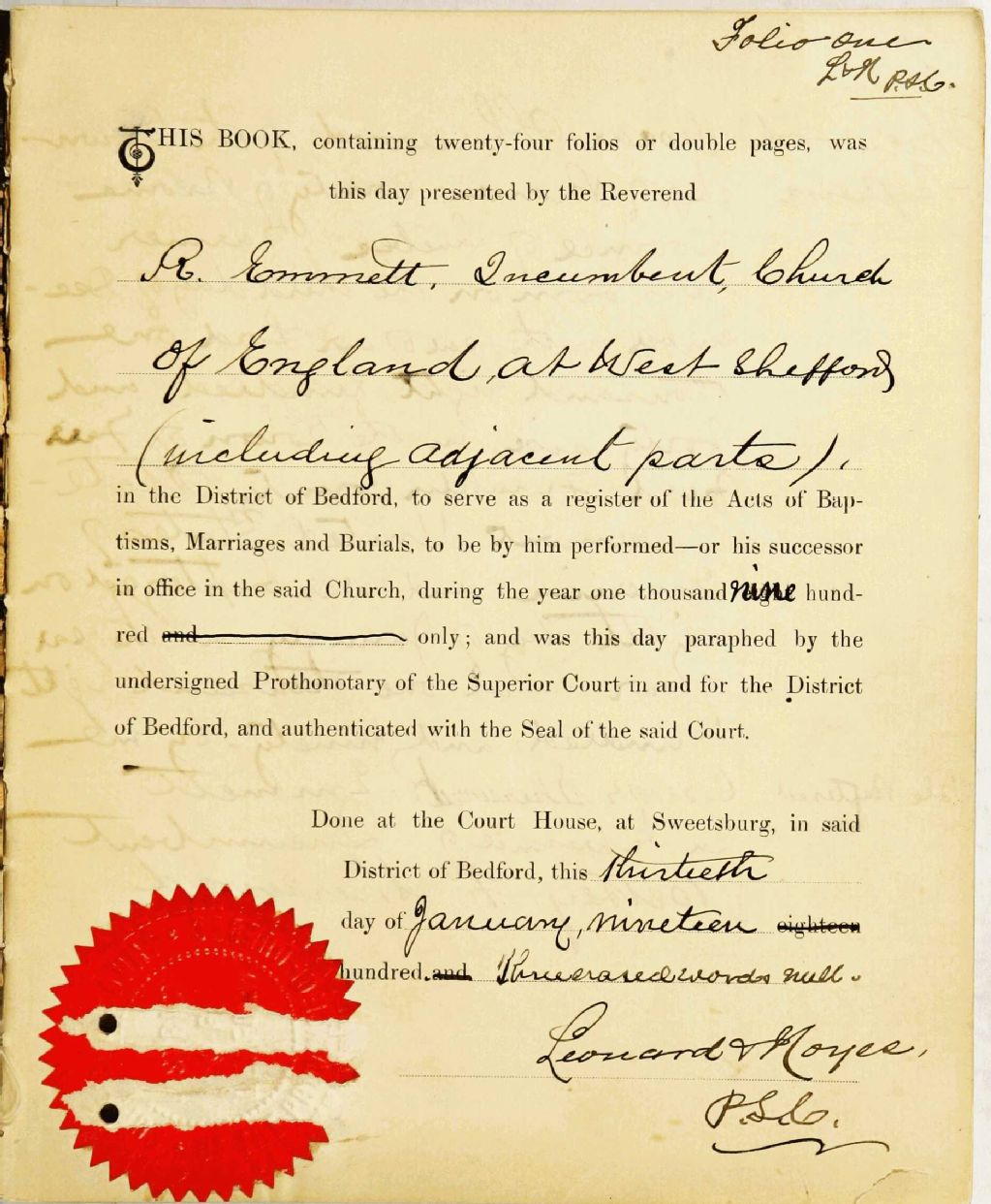St. John Anglican Church of West Shefford, 1900-1921, Archives nationales à Montréal, Fonds Cour supérieure. District judiciaire de Bedford. État civil, (06M,CE611,S98).
