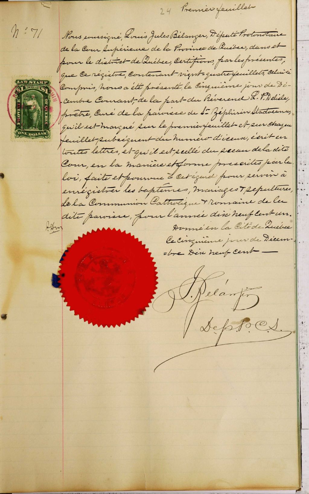 Saint-Zéphirin-de-Stadacona, 1896-1922, Archives nationales à Québec, Fonds Cour supérieure. District judiciaire de Québec. État civil, (03Q,CE301,S101).