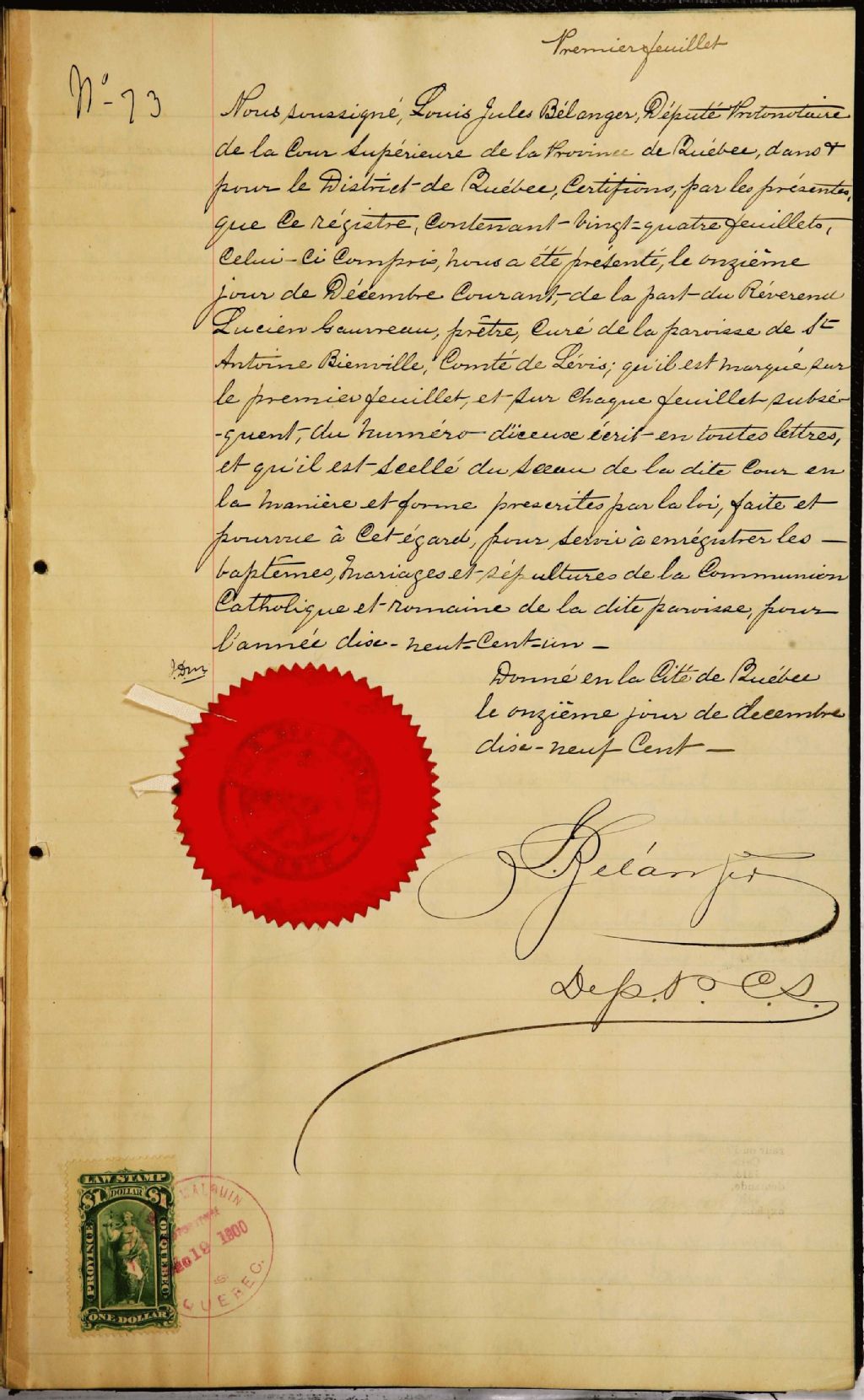 Saint-Antoine-de-Bienville, 1896-1922, Archives nationales à Québec, Fonds Cour supérieure. District judiciaire de Québec. État civil, (03Q,CE301,S107).