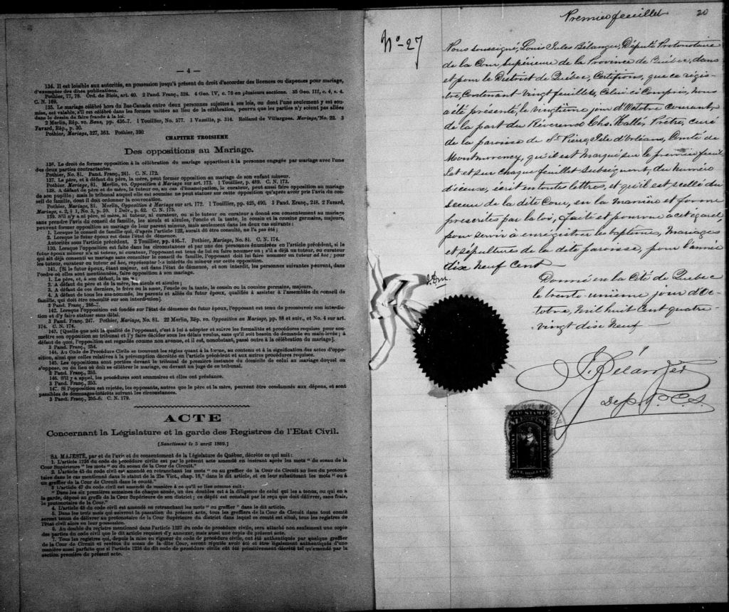 Saint-Pierre-et-Saint-Paul, Île d'Orléans, 1679-1922, Archives nationales à Québec, Fonds Cour supérieure. District judiciaire de Québec. État civil, (03Q,CE301,S12).