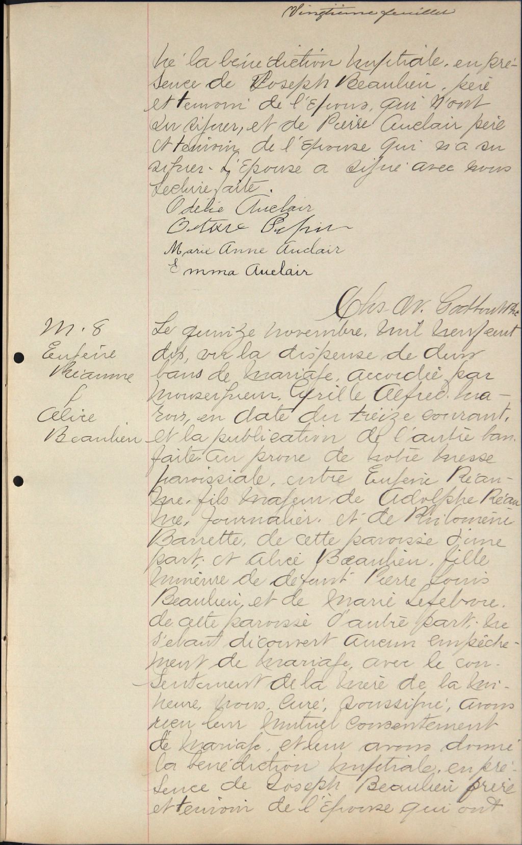 Notre-Dame-des-Laurentides, 1905-1922, Archives nationales à Québec, Fonds Cour supérieure. District judiciaire de Québec. État civil, (03Q,CE301,S129).