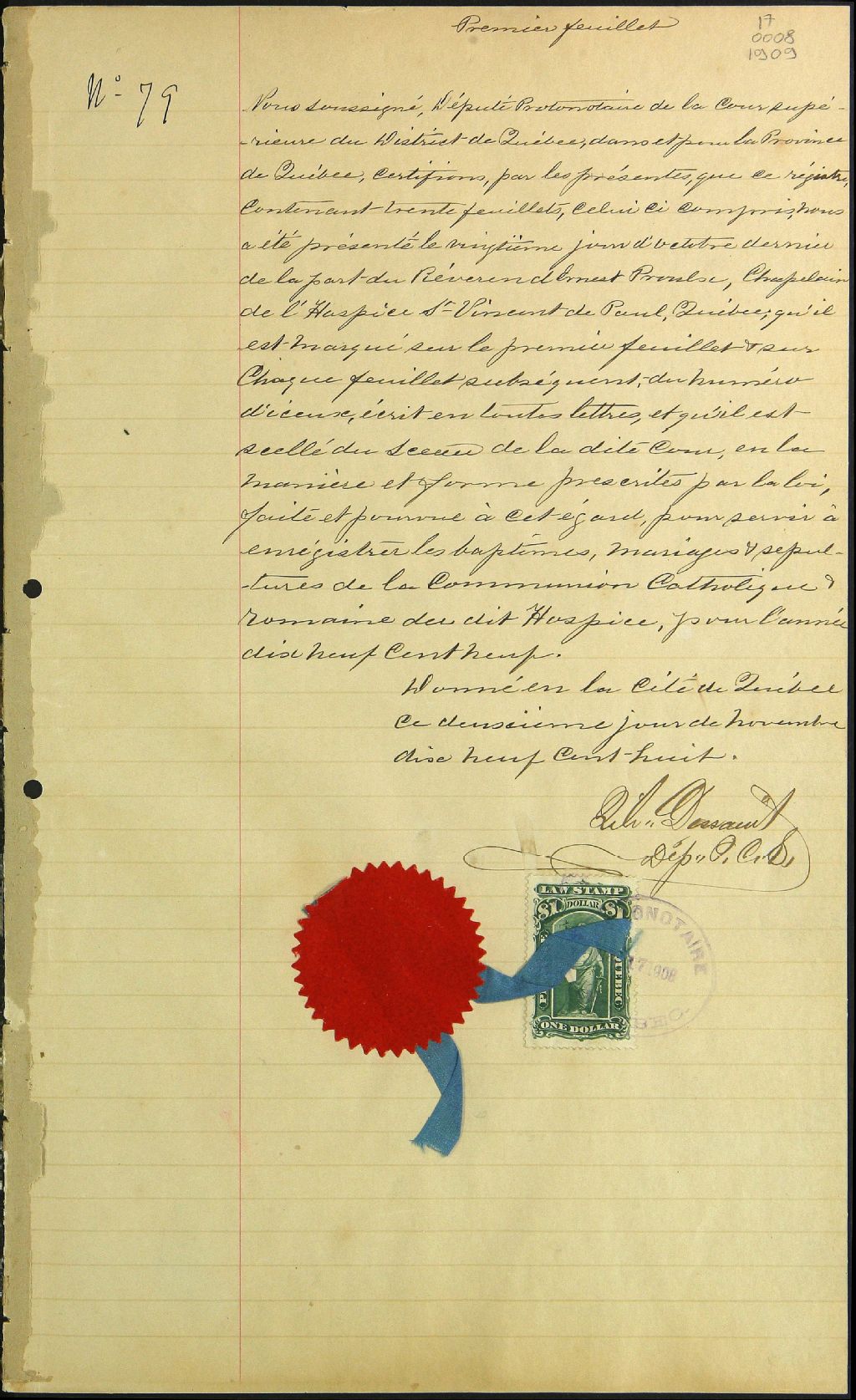 Hospice Saint-Vincent-de-Paul, 1909-1922, Archives nationales à Québec, Fonds Cour supérieure. District judiciaire de Québec. État civil, (03Q,CE301,S137).