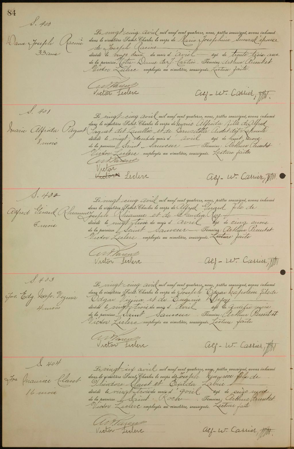 - Registres de la Compagnie du cimetière Saint-Charles contenant les sépultures de certaines paroisses dont Saint-Roch-de-Québec (CE301,S22) ; Notre-Dame-de-Jacques-Cartier (CE301,S33) ; Saint-Sauveur (CE301,S96) ; Saint-Zéphirin-de-Stadacona (CE301,S101) ; Saint-Charles-de-Limoilou (CE301,S117) et Saint-Angèle-de-Saint-Malo (CE301,S118) à partir de 1914
