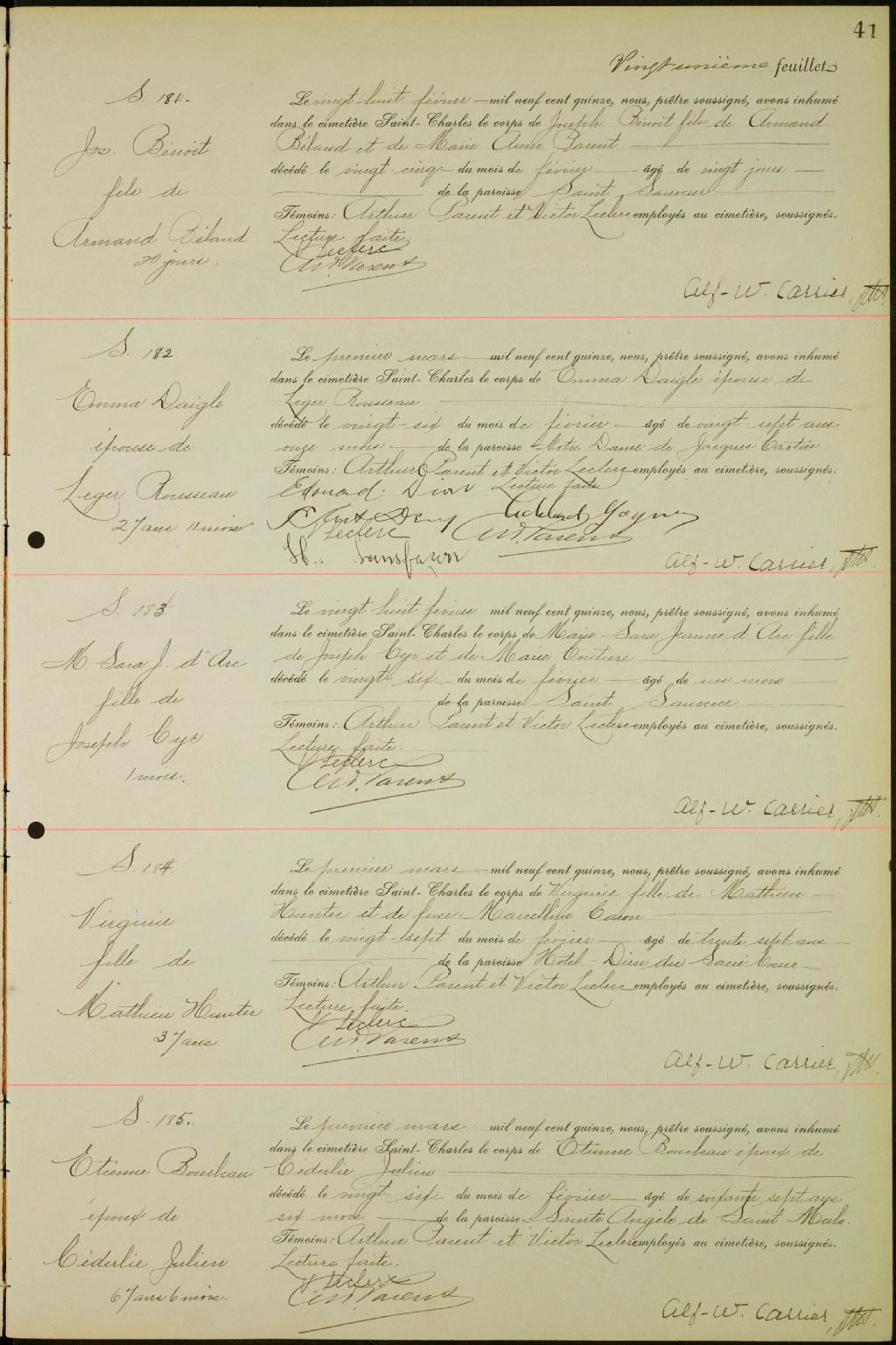 - Registres de la Compagnie du cimetière Saint-Charles contenant les sépultures de certaines paroisses dont Saint-Roch-de-Québec (CE301,S22) ; Notre-Dame-de-Jacques-Cartier (CE301,S33) ; Saint-Sauveur (CE301,S96) ; Saint-Zéphirin-de-Stadacona (CE301,S101) ; Saint-Charles-de-Limoilou (CE301,S117) et Saint-Angèle-de-Saint-Malo (CE301,S118) à partir de 1914