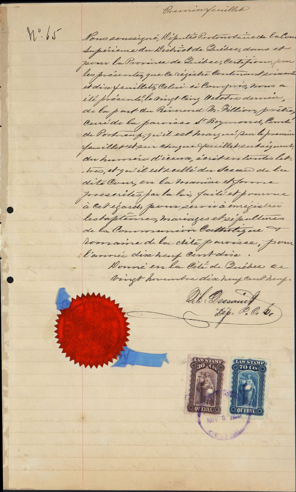 Saint-Raymond-Nonnat, 1844-1922, Archives nationales à Québec, Fonds Cour supérieure. District judiciaire de Québec. État civil, (03Q,CE301,S53).