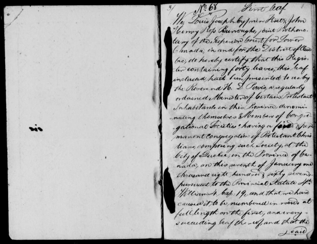 Quebec Congregational Church, 1838-1881, Archives nationales à Québec, Fonds Cour supérieure. District judiciaire de Québec. État civil, (03Q,CE301,S70).