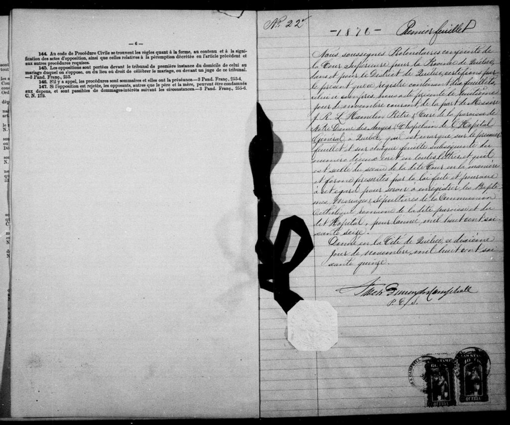 Hôpital Général de Québec et paroisse Notre-Dame-des-Anges, 1728-1922, Archives nationales à Québec, Fonds Cour supérieure. District judiciaire de Québec. État civil, (03Q,CE301,S93).