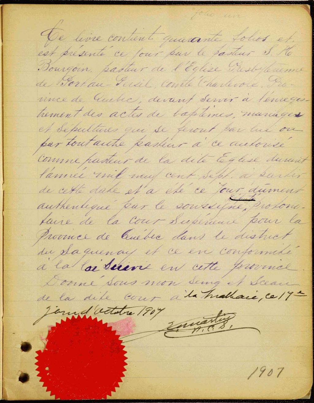 Église presbytérienne de Port-au-Persil, 1906-1909, 1912-1914, 1919, Archives nationales à Québec, Fonds Cour supérieure. District judiciaire de Saguenay. État civil, (03Q,CE304,S16).