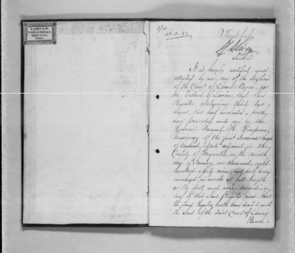First Inverness and Points Adjacent Anglican Church, 1849, Archives nationales à Québec, Fonds Cour supérieure. District judiciaire d'Arthabaska. État civil, (03Q,CE305,S29).
