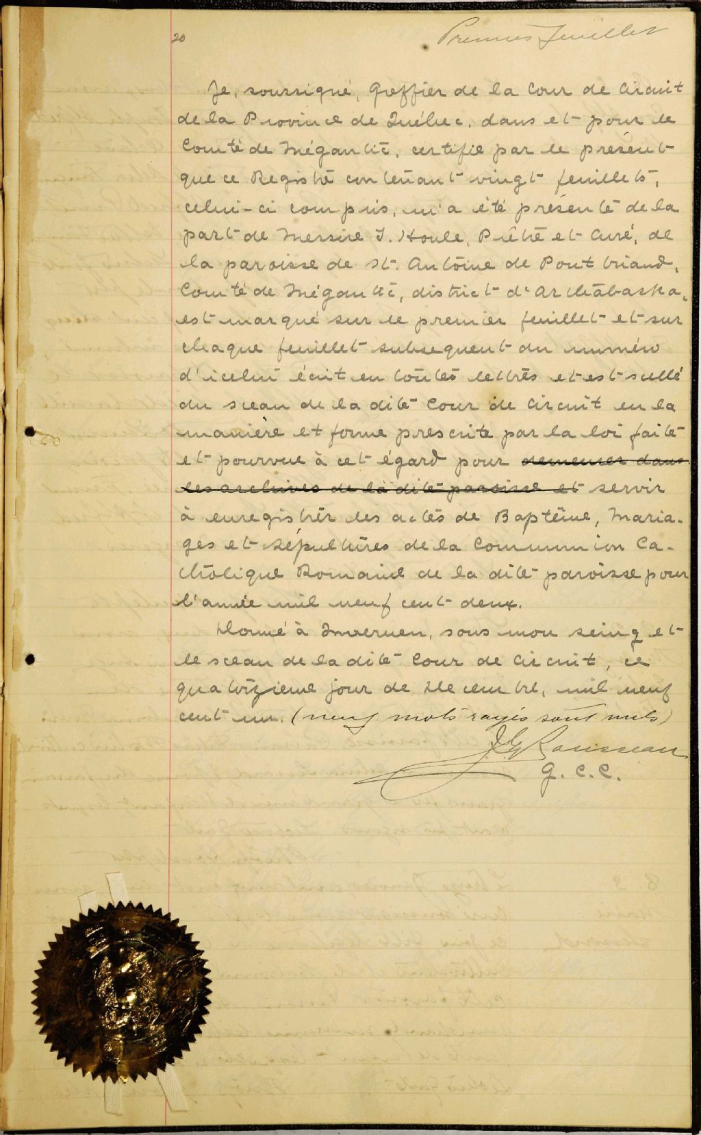 Saint-Antoine-de-Pontbriand, 1898-1922, Archives nationales à Québec, Fonds Cour supérieure. District judiciaire d'Arthabaska. État civil, (03Q,CE305,S38).