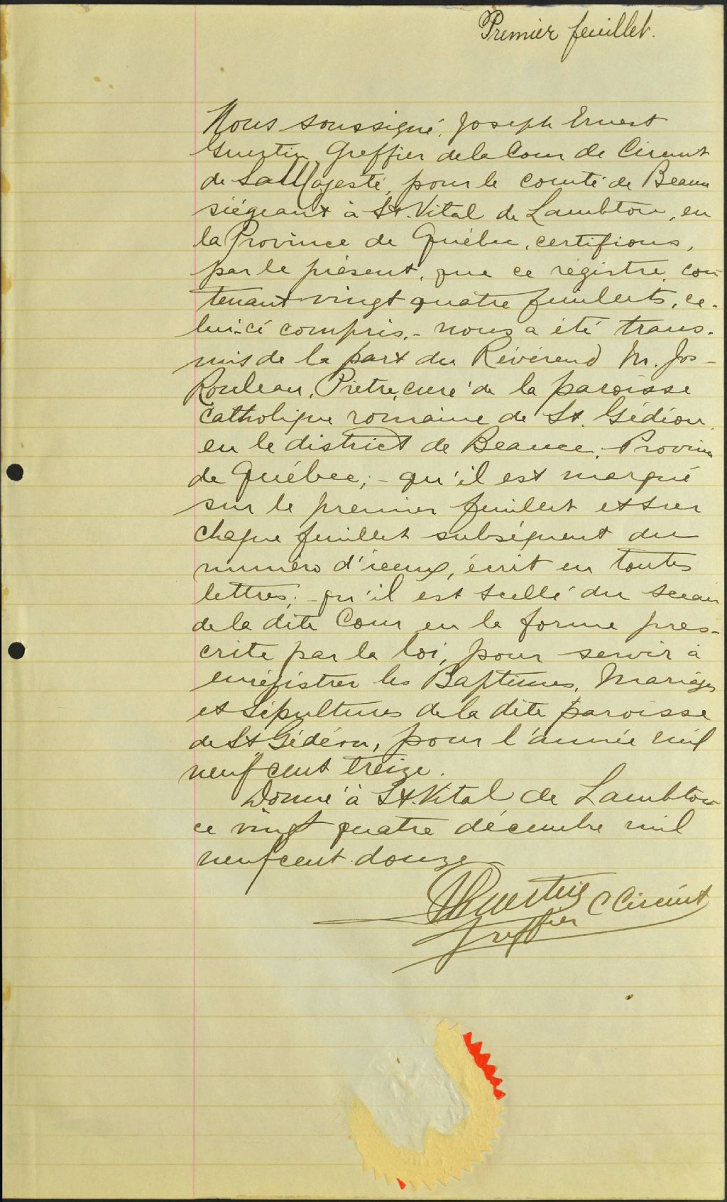 Saint-Gédéon-de-Beauce, 1899-1922, Archives nationales à Québec, Fonds Cour supérieure. District judiciaire de Beauce. État civil, (03Q,CE306,S13).