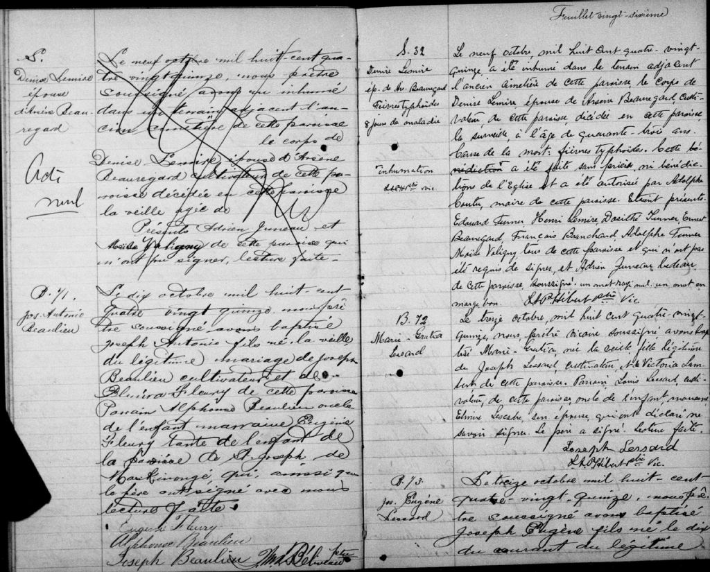 - Cette série regroupe les registres originaux de l'état civil, lesquels contiennent les enregistrements de baptêmes, de mariages et de sépultures consignés par le curé ou son représentant au cours de la période concernée par les documents.Outre les renseignements à caractère généalogique que nous pouvons y puiser, cette série peut constituer une source documentaire importante pour toute étude-statistique ou comparative sur les conditions de vie à différentes époques (mortalité infantile, espérance de vie) ou pour toute recherche portant sur l'occupation des terres (lieu de résidence), sur le mode de vie (métiers et professions, statut et âge des époux), sur les classes sociales (titres des parties impliquées, témoins/amis/parents présents lors d'un mariage), sur des évènements spéciaux (quelques mentions dans les sépultures) et sur des sujets à incidence médicale tels les maladies héréditaires (cause du décès)