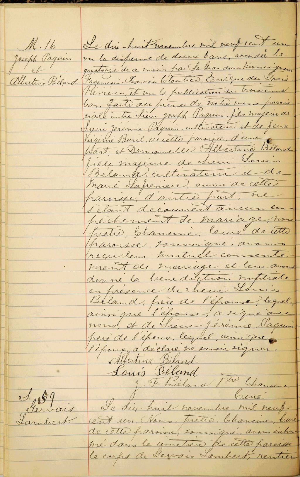- Cette série regroupe les registres originaux de l'état civil, lesquels contiennent les enregistrements de baptêmes, de mariages et de sépultures consignés par le curé ou son représentant au cours de la période concernée par les documents.Outre les renseignements à caractère généalogique que nous pouvons y puiser, cette série peut constituer une source documentaire importante pour toute étude-statistique ou comparative sur les conditions de vie à différentes époques (mortalité infantile, espérance de vie) ou pour toute recherche portant sur l'occupation des terres (lieu de résidence), sur le mode de vie (métiers et professions, statut et âge des époux), sur les classes sociales (titres des parties impliquées, témoins/amis/parents présents lors d'un mariage), sur des évènements spéciaux (quelques mentions dans les sépultures) et sur des sujets à incidence médicale tels les maladies héréditaires (cause du décès)