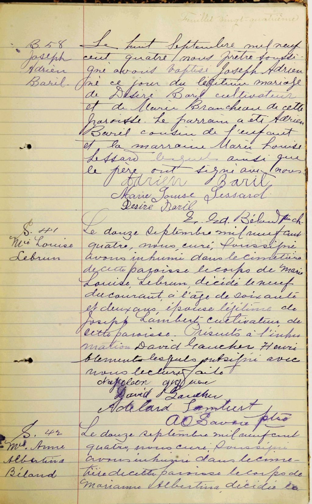 - Cette série regroupe les registres originaux de l'état civil, lesquels contiennent les enregistrements de baptêmes, de mariages et de sépultures consignés par le curé ou son représentant au cours de la période concernée par les documents.Outre les renseignements à caractère généalogique que nous pouvons y puiser, cette série peut constituer une source documentaire importante pour toute étude-statistique ou comparative sur les conditions de vie à différentes époques (mortalité infantile, espérance de vie) ou pour toute recherche portant sur l'occupation des terres (lieu de résidence), sur le mode de vie (métiers et professions, statut et âge des époux), sur les classes sociales (titres des parties impliquées, témoins/amis/parents présents lors d'un mariage), sur des évènements spéciaux (quelques mentions dans les sépultures) et sur des sujets à incidence médicale tels les maladies héréditaires (cause du décès)