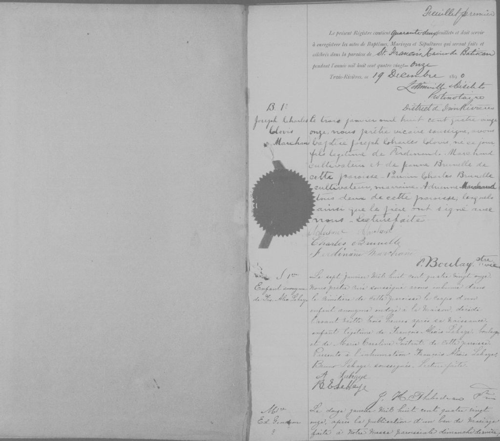 Saint-François-Xavier, 1679-1920, Archives nationales à Trois-Rivières, Fonds Cour supérieure. District judiciaire de Trois-Rivières. État civil, (04T,CE401,S2).