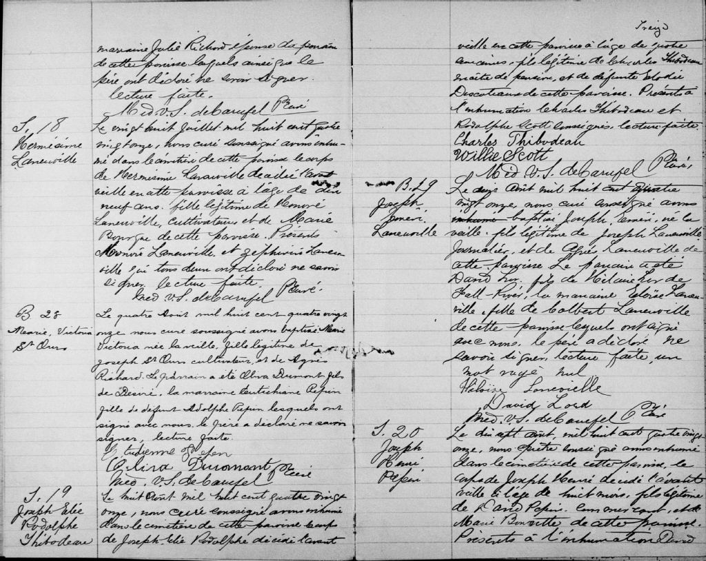 - Cette série regroupe les registres originaux de l'état civil, lesquels contiennent les enregistrements de baptêmes, de mariages et de sépultures consignés par le curé ou son représentant au cours de la période concernée par les documents.Outre les renseignements à caractère généalogique que nous pouvons y puiser, cette série peut constituer une source documentaire importante pour toute étude-statistique ou comparative sur les conditions de vie à différentes époques (mortalité infantile, espérance de vie) ou pour toute recherche portant sur l'occupation des terres (lieu de résidence), sur le mode de vie (métiers et professions, statut et âge des époux), sur les classes sociales (titres des parties impliquées, témoins/amis/parents présents lors d'un mariage), sur des évènements spéciaux (quelques mentions dans les sépultures) et sur des sujets à incidence médicale tels les maladies héréditaires (cause du décès)