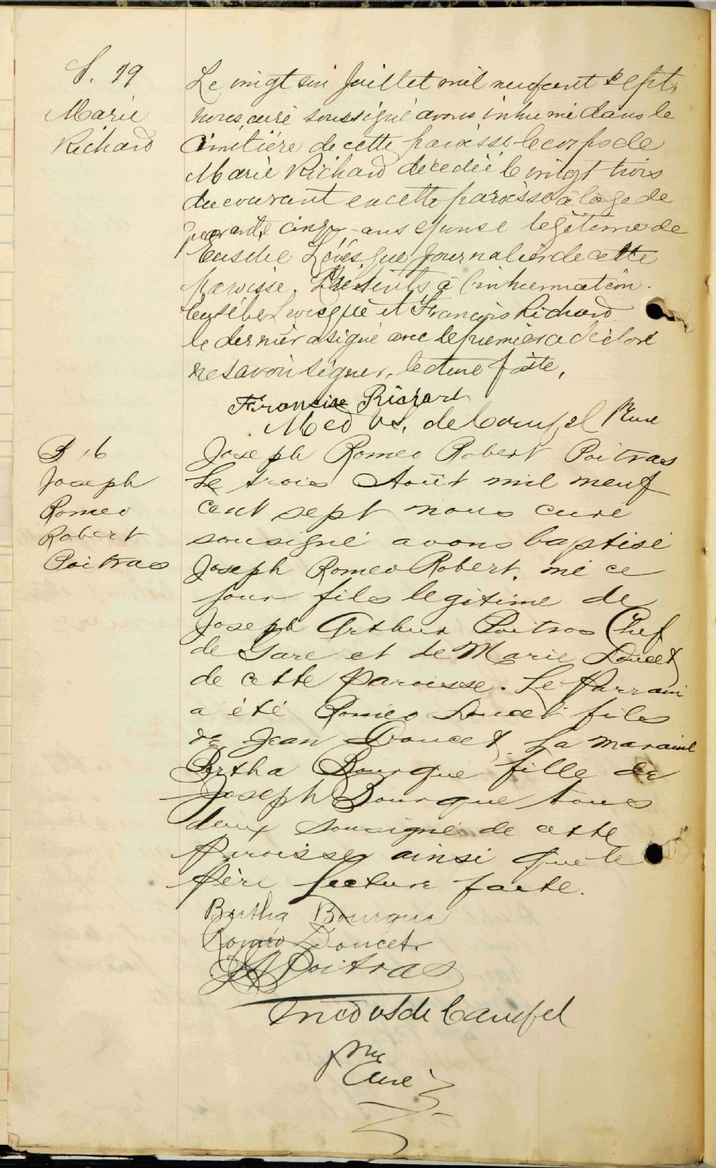 - Cette série regroupe les registres originaux de l'état civil, lesquels contiennent les enregistrements de baptêmes, de mariages et de sépultures consignés par le curé ou son représentant au cours de la période concernée par les documents.Outre les renseignements à caractère généalogique que nous pouvons y puiser, cette série peut constituer une source documentaire importante pour toute étude-statistique ou comparative sur les conditions de vie à différentes époques (mortalité infantile, espérance de vie) ou pour toute recherche portant sur l'occupation des terres (lieu de résidence), sur le mode de vie (métiers et professions, statut et âge des époux), sur les classes sociales (titres des parties impliquées, témoins/amis/parents présents lors d'un mariage), sur des évènements spéciaux (quelques mentions dans les sépultures) et sur des sujets à incidence médicale tels les maladies héréditaires (cause du décès)