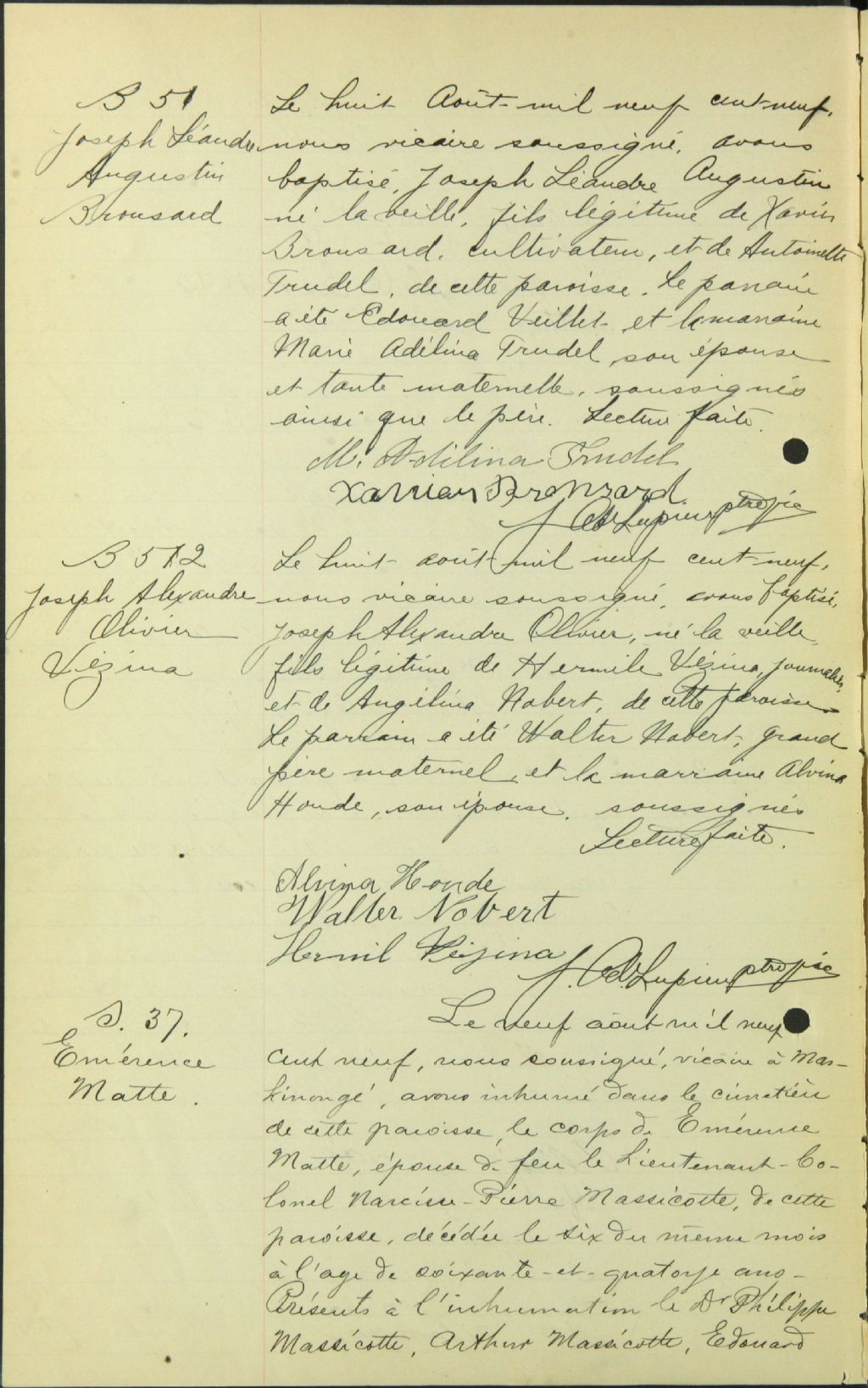 - Cette série regroupe les registres originaux de l'état civil, lesquels contiennent les enregistrements de baptêmes, de mariages et de sépultures consignés par le curé ou son représentant au cours de la période concernée par les documents.Outre les renseignements à caractère généalogique que nous pouvons y puiser, cette série peut constituer une source documentaire importante pour toute étude-statistique ou comparative sur les conditions de vie à différentes époques (mortalité infantile, espérance de vie) ou pour toute recherche portant sur l'occupation des terres (lieu de résidence), sur le mode de vie (métiers et professions, statut et âge des époux), sur les classes sociales (titres des parties impliquées, témoins/amis/parents présents lors d'un mariage), sur des évènements spéciaux (quelques mentions dans les sépultures) et sur des sujets à incidence médicale tels les maladies héréditaires (cause du décès)