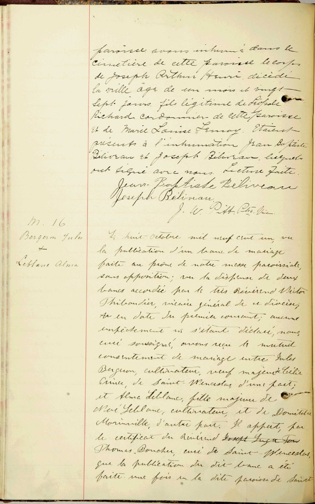 - Cette série regroupe les registres originaux de l'état civil, lesquels contiennent les enregistrements de baptêmes, de mariages et de sépultures consignés par le curé ou son représentant au cours de la période concernée par les documents.Outre les renseignements à caractère généalogique que nous pouvons y puiser, cette série peut constituer une source documentaire importante pour toute étude-statistique ou comparative sur les conditions de vie à différentes époques (mortalité infantile, espérance de vie) ou pour toute recherche portant sur l'occupation des terres (lieu de résidence), sur le mode de vie (métiers et professions, statut et âge des époux), sur les classes sociales (titres des parties impliquées, témoins/amis/parents présents lors d'un mariage), sur des évènements spéciaux (quelques mentions dans les sépultures) et sur des sujets à incidence médicale tels les maladies héréditaires (cause du décès)