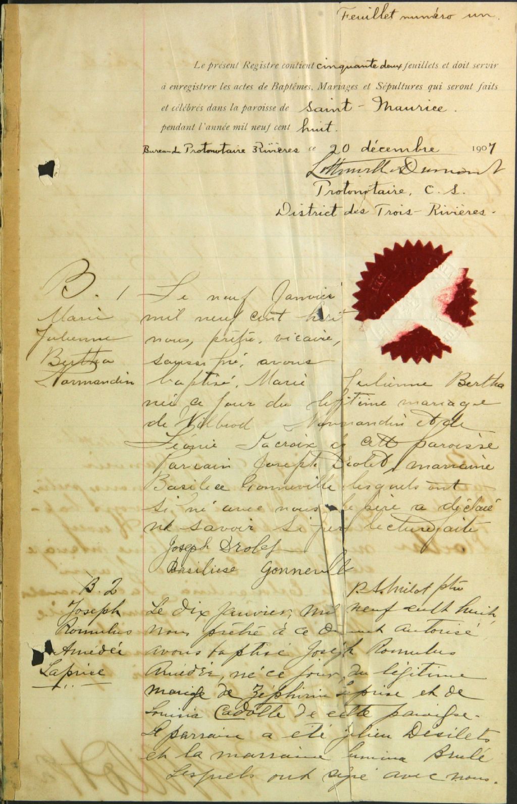 - Cette série regroupe les registres originaux de l'état civil, lesquels contiennent les enregistrements de baptêmes, de mariages et de sépultures consignés par le curé ou son représentant au cours de la période concernée par les documents.Outre les renseignements à caractère généalogique que nous pouvons y puiser, cette série peut constituer une source documentaire importante pour toute étude-statistique ou comparative sur les conditions de vie à différentes époques (mortalité infantile, espérance de vie) ou pour toute recherche portant sur l'occupation des terres (lieu de résidence), sur le mode de vie (métiers et professions, statut et âge des époux), sur les classes sociales (titres des parties impliquées, témoins/amis/parents présents lors d'un mariage), sur des évènements spéciaux (quelques mentions dans les sépultures) et sur des sujets à incidence médicale tels les maladies héréditaires (cause du décès)