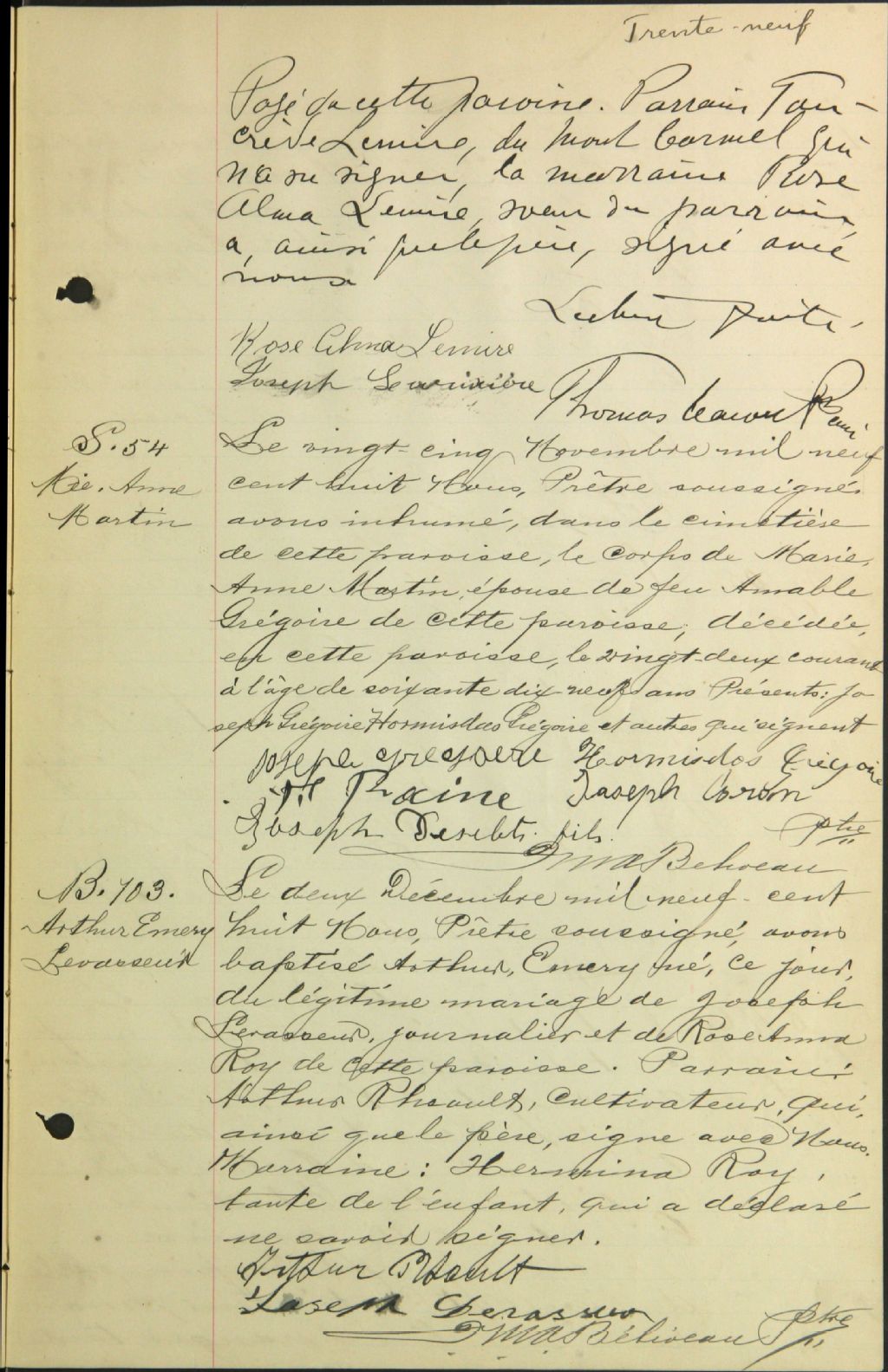 - Cette série regroupe les registres originaux de l'état civil, lesquels contiennent les enregistrements de baptêmes, de mariages et de sépultures consignés par le curé ou son représentant au cours de la période concernée par les documents.Outre les renseignements à caractère généalogique que nous pouvons y puiser, cette série peut constituer une source documentaire importante pour toute étude-statistique ou comparative sur les conditions de vie à différentes époques (mortalité infantile, espérance de vie) ou pour toute recherche portant sur l'occupation des terres (lieu de résidence), sur le mode de vie (métiers et professions, statut et âge des époux), sur les classes sociales (titres des parties impliquées, témoins/amis/parents présents lors d'un mariage), sur des évènements spéciaux (quelques mentions dans les sépultures) et sur des sujets à incidence médicale tels les maladies héréditaires (cause du décès)