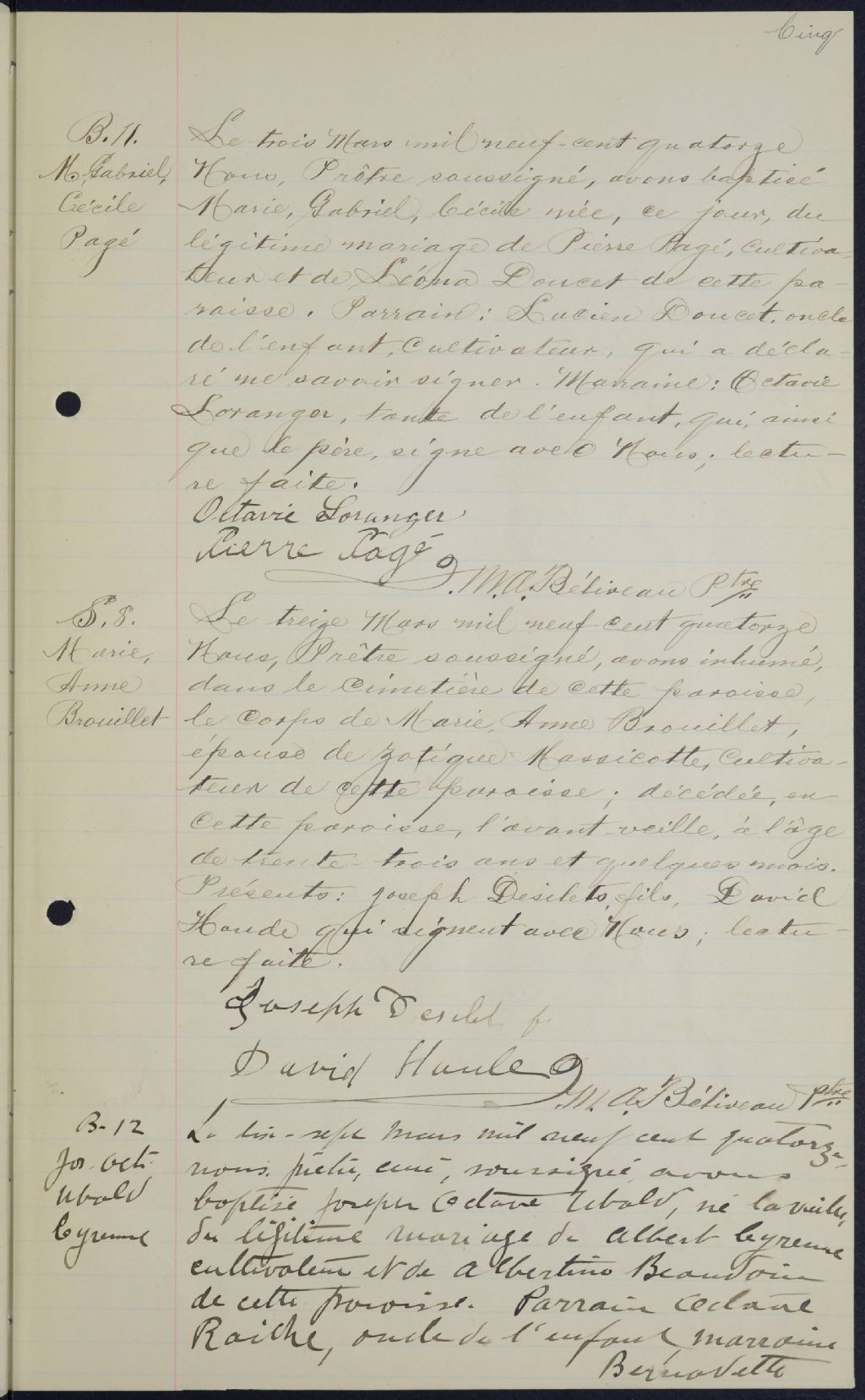 - Cette série regroupe les registres originaux de l'état civil, lesquels contiennent les enregistrements de baptêmes, de mariages et de sépultures consignés par le curé ou son représentant au cours de la période concernée par les documents.Outre les renseignements à caractère généalogique que nous pouvons y puiser, cette série peut constituer une source documentaire importante pour toute étude-statistique ou comparative sur les conditions de vie à différentes époques (mortalité infantile, espérance de vie) ou pour toute recherche portant sur l'occupation des terres (lieu de résidence), sur le mode de vie (métiers et professions, statut et âge des époux), sur les classes sociales (titres des parties impliquées, témoins/amis/parents présents lors d'un mariage), sur des évènements spéciaux (quelques mentions dans les sépultures) et sur des sujets à incidence médicale tels les maladies héréditaires (cause du décès)