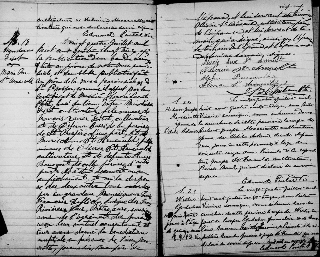 - Cette série regroupe les registres originaux de l'état civil, lesquels contiennent les enregistrements de baptêmes, de mariages et de sépultures consignés par le curé ou son représentant au cours de la période concernée par les documents.Outre les renseignements à caractère généalogique que nous pouvons y puiser, cette série peut constituer une source documentaire importante pour toute étude-statistique ou comparative sur les conditions de vie à différentes époques (mortalité infantile, espérance de vie) ou pour toute recherche portant sur l'occupation des terres (lieu de résidence), sur le mode de vie (métiers et professions, statut et âge des époux), sur les classes sociales (titres des parties impliquées, témoins/amis/parents présents lors d'un mariage), sur des évènements spéciaux (quelques mentions dans les sépultures) et sur des sujets à incidence médicale tels les maladies héréditaires (cause du décès)