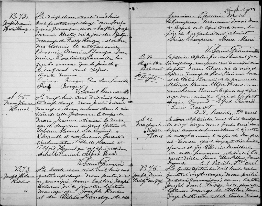 - Cette série regroupe les registres originaux de l'état civil, lesquels contiennent les enregistrements de baptêmes, de mariages et de sépultures consignés par le curé ou son représentant au cours de la période concernée par les documents.Outre les renseignements à caractère généalogique que nous pouvons y puiser, cette série peut constituer une source documentaire importante pour toute étude-statistique ou comparative sur les conditions de vie à différentes époques (mortalité infantile, espérance de vie) ou pour toute recherche portant sur l'occupation des terres (lieu de résidence), sur le mode de vie (métiers et professions, statut et âge des époux), sur les classes sociales (titres des parties impliquées, témoins/amis/parents présents lors d'un mariage), sur des évènements spéciaux (quelques mentions dans les sépultures) et sur des sujets à incidence médicale tels les maladies héréditaires (cause du décès)