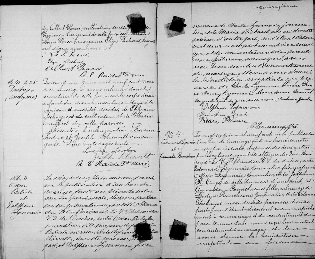 - Cette série regroupe les registres originaux de l'état civil, lesquels contiennent les enregistrements de baptêmes, de mariages et de sépultures consignés par le curé ou son représentant au cours de la période concernée par les documents.Outre les renseignements à caractère généalogique que nous pouvons y puiser, cette série peut constituer une source documentaire importante pour toute étude-statistique ou comparative sur les conditions de vie à différentes époques (mortalité infantile, espérance de vie) ou pour toute recherche portant sur l'occupation des terres (lieu de résidence), sur le mode de vie (métiers et professions, statut et âge des époux), sur les classes sociales (titres des parties impliquées, témoins/amis/parents présents lors d'un mariage), sur des évènements spéciaux (quelques mentions dans les sépultures) et sur des sujets à incidence médicale tels les maladies héréditaires (cause du décès)