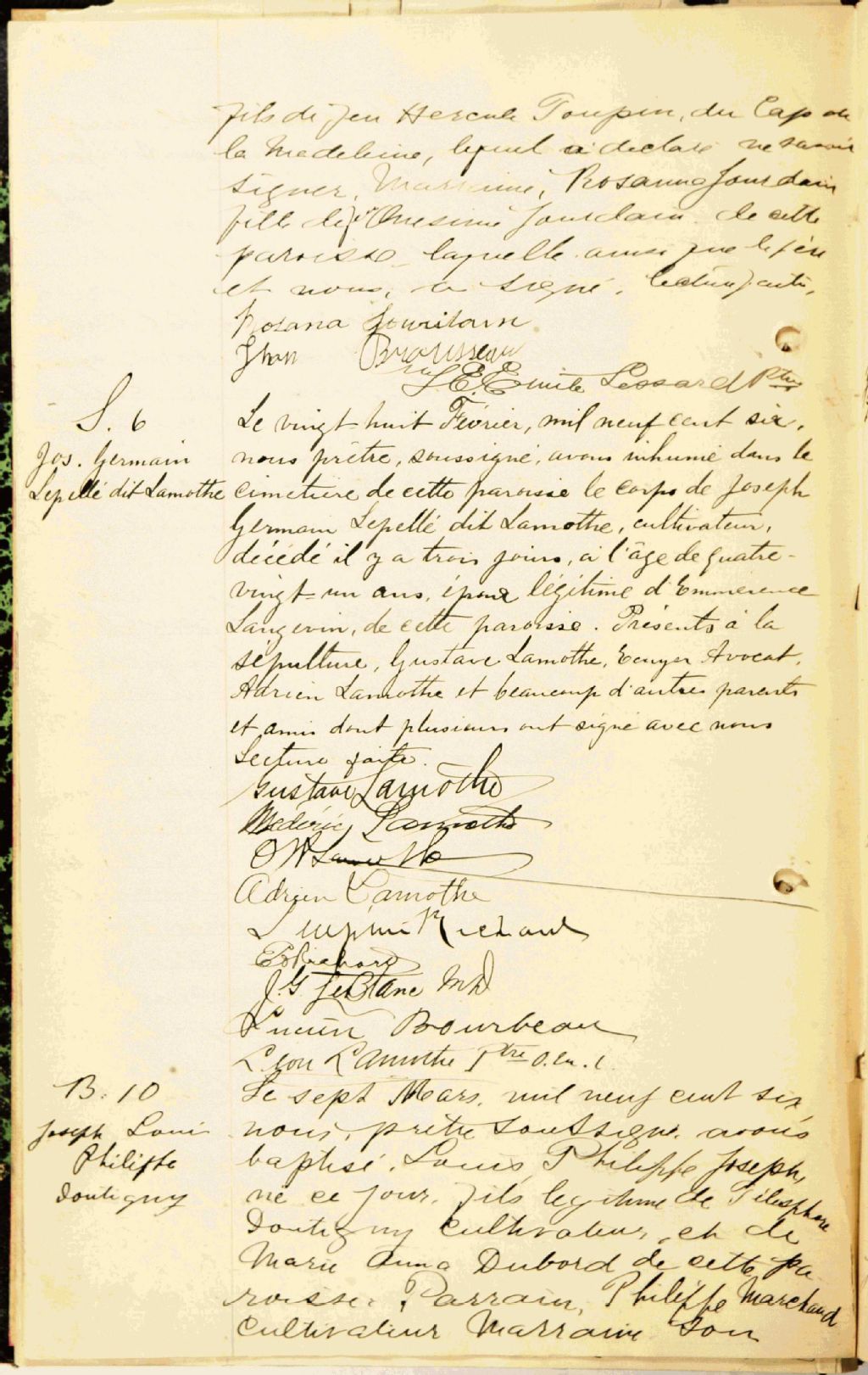 - Cette série regroupe les registres originaux de l'état civil, lesquels contiennent les enregistrements de baptêmes, de mariages et de sépultures consignés par le curé ou son représentant au cours de la période concernée par les documents.Outre les renseignements à caractère généalogique que nous pouvons y puiser, cette série peut constituer une source documentaire importante pour toute étude-statistique ou comparative sur les conditions de vie à différentes époques (mortalité infantile, espérance de vie) ou pour toute recherche portant sur l'occupation des terres (lieu de résidence), sur le mode de vie (métiers et professions, statut et âge des époux), sur les classes sociales (titres des parties impliquées, témoins/amis/parents présents lors d'un mariage), sur des évènements spéciaux (quelques mentions dans les sépultures) et sur des sujets à incidence médicale tels les maladies héréditaires (cause du décès).Cette série contient les manuscrits originaux des registres civils (1679-1900), des transcriptions des reqistres civils (1679-1776) et des photocopies de registres paroissiaux (1680-1744). Toutes catégories confondues, il manquerait les actes de janvier à septembre 1744, 1746-1749, 1751-1752 et 1764 à novembre 1774. Pour ces années, le chercheur doit consulter les registres paroissiaux