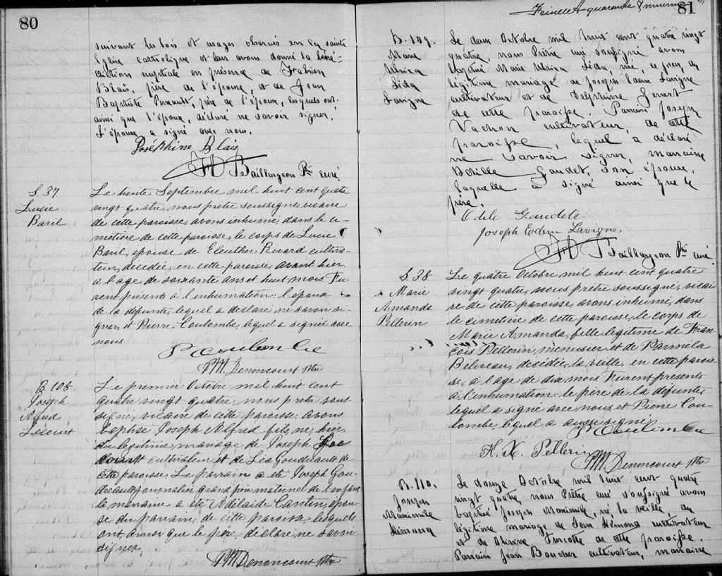 - Cette série regroupe les registres originaux de l'état civil, lesquels contiennent les enregistrements de baptêmes, de mariages et de sépultures consignés par le curé ou son représentant au cours de la période concernée par les documents.Outre les renseignements à caractère généalogique que nous pouvons y puiser, cette série peut constituer une source documentaire importante pour toute étude-statistique ou comparative sur les conditions de vie à différentes époques (mortalité infantile, espérance de vie) ou pour toute recherche portant sur l'occupation des terres (lieu de résidence), sur le mode de vie (métiers et professions, statut et âge des époux), sur les classes sociales (titres des parties impliquées, témoins/amis/parents présents lors d'un mariage), sur des évènements spéciaux (quelques mentions dans les sépultures) et sur des sujets à incidence médicale tels les maladies héréditaires (cause du décès).Cette série regroupe les registres originaux de l'état civil, lesquels contiennent les enregistrements de baptêmes, de mariages et de sépultures consignés par le curé ou son représentant au cours de la période concernée par les documents