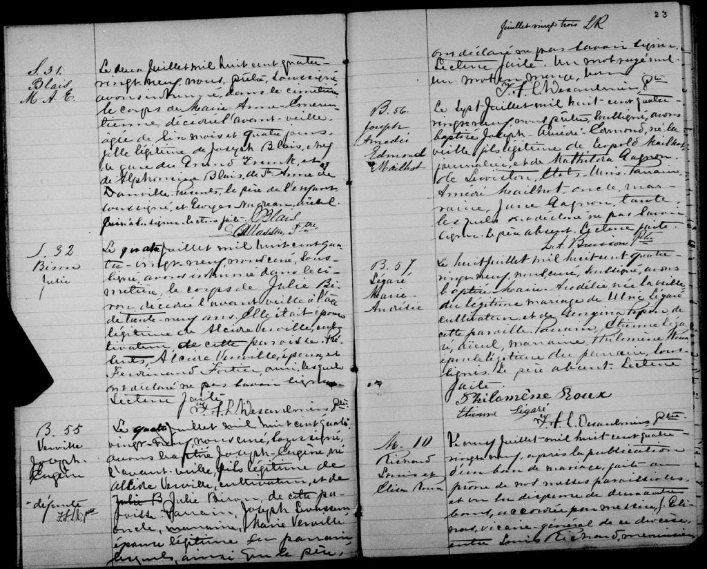 - Cette série regroupe les registres originaux de l'état civil, lesquels contiennent les enregistrements de baptêmes, de mariages et de sépultures consignés par le curé ou son représentant au cours de la période concernée par les documents.Outre les renseignements à caractère généalogique que nous pouvons y puiser, cette série peut constituer une source documentaire importante pour toute étude-statistique ou comparative sur les conditions de vie à différentes époques (mortalité infantile, espérance de vie) ou pour toute recherche portant sur l'occupation des terres (lieu de résidence), sur le mode de vie (métiers et professions, statut et âge des époux), sur les classes sociales (titres des parties impliquées, témoins/amis/parents présents lors d'un mariage), sur des évènements spéciaux (quelques mentions dans les sépultures) et sur des sujets à incidence médicale tels les maladies héréditaires (cause du décès).Cette série regroupe les registres originaux de l'état civil, lesquels contiennent les enregistrements de baptêmes, de mariages et de sépultures consignés par le curé ou son représentant au cours de la période concernée par les documents