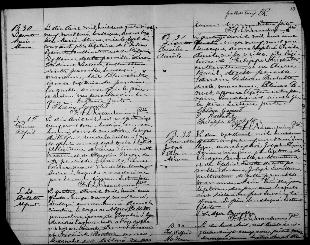 - Cette série regroupe les registres originaux de l'état civil, lesquels contiennent les enregistrements de baptêmes, de mariages et de sépultures consignés par le curé ou son représentant au cours de la période concernée par les documents.Outre les renseignements à caractère généalogique que nous pouvons y puiser, cette série peut constituer une source documentaire importante pour toute étude-statistique ou comparative sur les conditions de vie à différentes époques (mortalité infantile, espérance de vie) ou pour toute recherche portant sur l'occupation des terres (lieu de résidence), sur le mode de vie (métiers et professions, statut et âge des époux), sur les classes sociales (titres des parties impliquées, témoins/amis/parents présents lors d'un mariage), sur des évènements spéciaux (quelques mentions dans les sépultures) et sur des sujets à incidence médicale tels les maladies héréditaires (cause du décès).Cette série regroupe les registres originaux de l'état civil, lesquels contiennent les enregistrements de baptêmes, de mariages et de sépultures consignés par le curé ou son représentant au cours de la période concernée par les documents