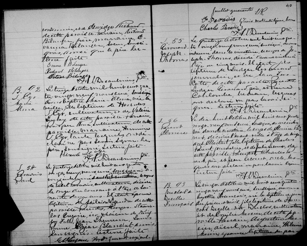 - Cette série regroupe les registres originaux de l'état civil, lesquels contiennent les enregistrements de baptêmes, de mariages et de sépultures consignés par le curé ou son représentant au cours de la période concernée par les documents.Outre les renseignements à caractère généalogique que nous pouvons y puiser, cette série peut constituer une source documentaire importante pour toute étude-statistique ou comparative sur les conditions de vie à différentes époques (mortalité infantile, espérance de vie) ou pour toute recherche portant sur l'occupation des terres (lieu de résidence), sur le mode de vie (métiers et professions, statut et âge des époux), sur les classes sociales (titres des parties impliquées, témoins/amis/parents présents lors d'un mariage), sur des évènements spéciaux (quelques mentions dans les sépultures) et sur des sujets à incidence médicale tels les maladies héréditaires (cause du décès).Cette série regroupe les [...]