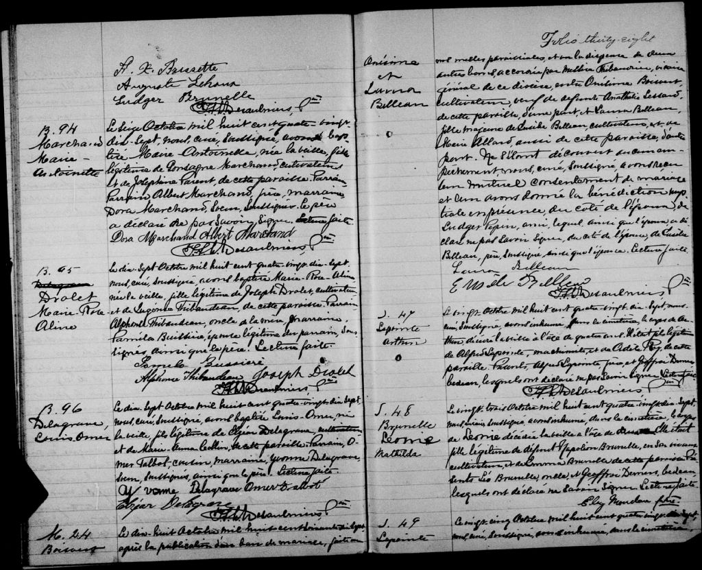 - Cette série regroupe les registres originaux de l'état civil, lesquels contiennent les enregistrements de baptêmes, de mariages et de sépultures consignés par le curé ou son représentant au cours de la période concernée par les documents.Outre les renseignements à caractère généalogique que nous pouvons y puiser, cette série peut constituer une source documentaire importante pour toute étude-statistique ou comparative sur les conditions de vie à différentes époques (mortalité infantile, espérance de vie) ou pour toute recherche portant sur l'occupation des terres (lieu de résidence), sur le mode de vie (métiers et professions, statut et âge des époux), sur les classes sociales (titres des parties impliquées, témoins/amis/parents présents lors d'un mariage), sur des évènements spéciaux (quelques mentions dans les sépultures) et sur des sujets à incidence médicale tels les maladies héréditaires (cause du décès).Cette série regroupe les [...]