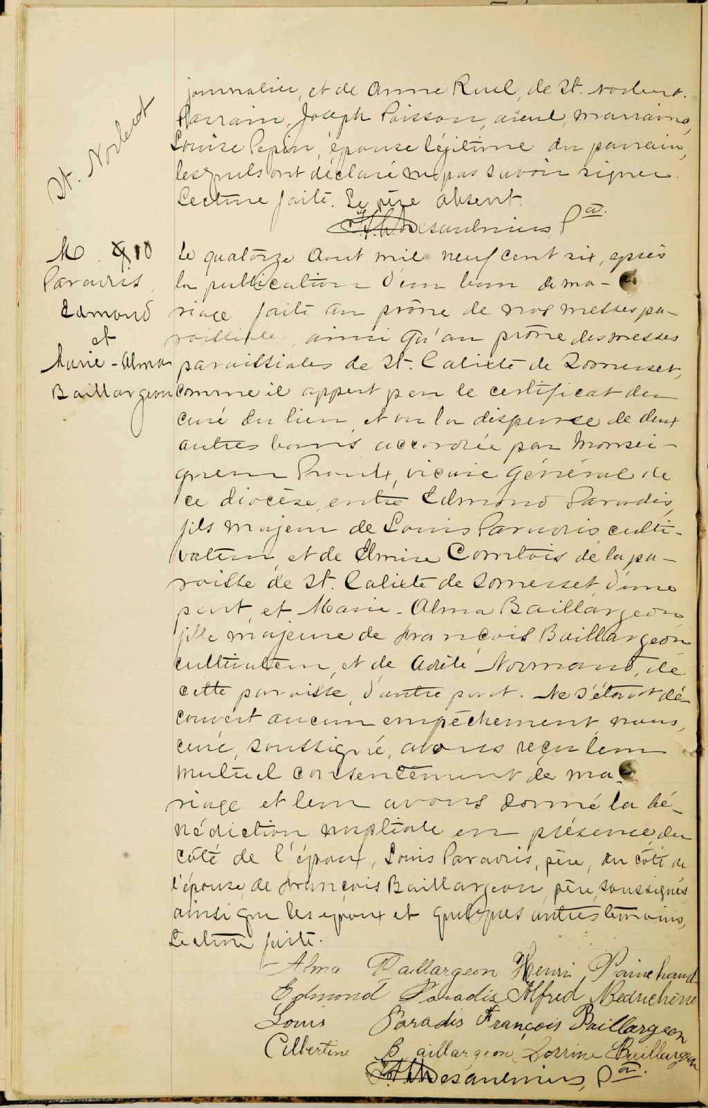 - Cette série regroupe les registres originaux de l'état civil, lesquels contiennent les enregistrements de baptêmes, de mariages et de sépultures consignés par le curé ou son représentant au cours de la période concernée par les documents.Outre les renseignements à caractère généalogique que nous pouvons y puiser, cette série peut constituer une source documentaire importante pour toute étude-statistique ou comparative sur les conditions de vie à différentes époques (mortalité infantile, espérance de vie) ou pour toute recherche portant sur l'occupation des terres (lieu de résidence), sur le mode de vie (métiers et professions, statut et âge des époux), sur les classes sociales (titres des parties impliquées, témoins/amis/parents présents lors d'un mariage), sur des évènements spéciaux (quelques mentions dans les sépultures) et sur des sujets à incidence médicale tels les maladies héréditaires (cause du décès).Cette série regroupe les registres originaux de l'état civil, lesquels contiennent les enregistrements de baptêmes, de mariages et de sépultures consignés par le curé ou son représentant au cours de la période concernée par les documents