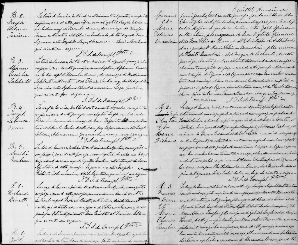 - Cette série regroupe les registres originaux de l'état civil, lesquels contiennent les enregistrements de baptêmes, de mariages et de sépultures consignés par le curé ou son représentant au cours de la période concernée par les documents.Outre les renseignements à caractère généalogique que nous pouvons y puiser, cette série peut constituer une source documentaire importante pour toute étude-statistique ou comparative sur les conditions de vie à différentes époques (mortalité infantile, espérance de vie) ou pour toute recherche portant sur l'occupation des terres (lieu de résidence), sur le mode de vie (métiers et professions, statut et âge des époux), sur les classes sociales (titres des parties impliquées, témoins/amis/parents présents lors d'un mariage), sur des évènements spéciaux (quelques mentions dans les sépultures) et sur des sujets à incidence médicale tels les maladies héréditaires (cause du décès).Cette série regroupe les registres originaux de l'état civil, lesquels contiennent les enregistrements de baptêmes, de mariages et de sépultures consignés par le curé ou son représentant au cours de la période concernée par les documents