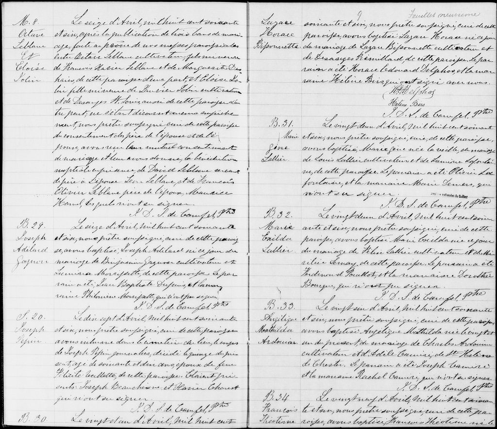 - Cette série regroupe les registres originaux de l'état civil, lesquels contiennent les enregistrements de baptêmes, de mariages et de sépultures consignés par le curé ou son représentant au cours de la période concernée par les documents.Outre les renseignements à caractère généalogique que nous pouvons y puiser, cette série peut constituer une source documentaire importante pour toute étude-statistique ou comparative sur les conditions de vie à différentes époques (mortalité infantile, espérance de vie) ou pour toute recherche portant sur l'occupation des terres (lieu de résidence), sur le mode de vie (métiers et professions, statut et âge des époux), sur les classes sociales (titres des parties impliquées, témoins/amis/parents présents lors d'un mariage), sur des évènements spéciaux (quelques mentions dans les sépultures) et sur des sujets à incidence médicale tels les maladies héréditaires (cause du décès).Cette série regroupe les registres originaux de l'état civil, lesquels contiennent les enregistrements de baptêmes, de mariages et de sépultures consignés par le curé ou son représentant au cours de la période concernée par les documents