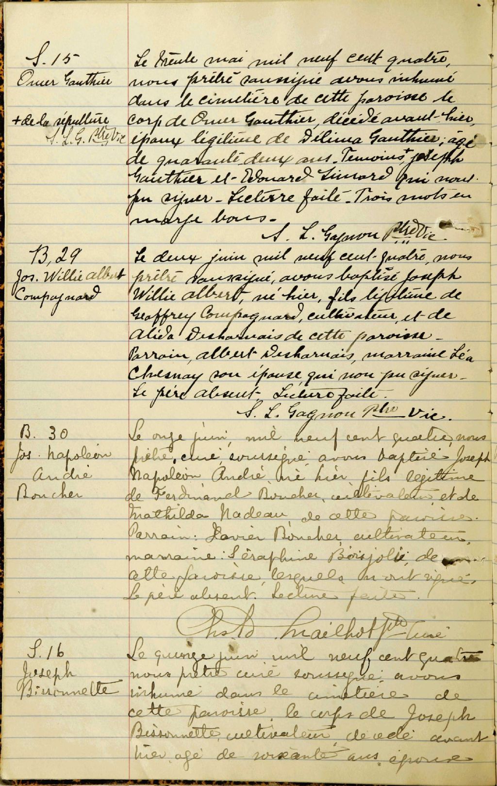 - Cette série regroupe les registres originaux de l'état civil, lesquels contiennent les enregistrements de baptêmes, de mariages et de sépultures consignés par le curé ou son représentant au cours de la période concernée par les documents.Outre les renseignements à caractère généalogique que nous pouvons y puiser, cette série peut constituer une source documentaire importante pour toute étude-statistique ou comparative sur les conditions de vie à différentes époques (mortalité infantile, espérance de vie) ou pour toute recherche portant sur l'occupation des terres (lieu de résidence), sur le mode de vie (métiers et professions, statut et âge des époux), sur les classes sociales (titres des parties impliquées, témoins/amis/parents présents lors d'un mariage), sur des évènements spéciaux (quelques mentions dans les sépultures) et sur des sujets à incidence médicale tels les maladies héréditaires (cause du décès).Cette série regroupe les registres originaux de l'état civil, lesquels contiennent les enregistrements de baptêmes, de mariages et de sépultures consignés par le curé ou son représentant au cours de la période concernée par les documents