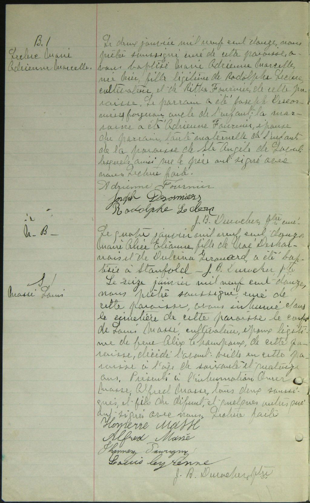 - Cette série regroupe les registres originaux de l'état civil, lesquels contiennent les enregistrements de baptêmes, de mariages et de sépultures consignés par le curé ou son représentant au cours de la période concernée par les documents.Outre les renseignements à caractère généalogique que nous pouvons y puiser, cette série peut constituer une source documentaire importante pour toute étude-statistique ou comparative sur les conditions de vie à différentes époques (mortalité infantile, espérance de vie) ou pour toute recherche portant sur l'occupation des terres (lieu de résidence), sur le mode de vie (métiers et professions, statut et âge des époux), sur les classes sociales (titres des parties impliquées, témoins/amis/parents présents lors d'un mariage), sur des évènements spéciaux (quelques mentions dans les sépultures) et sur des sujets à incidence médicale tels les maladies héréditaires (cause du décès).Cette série regroupe les [...]