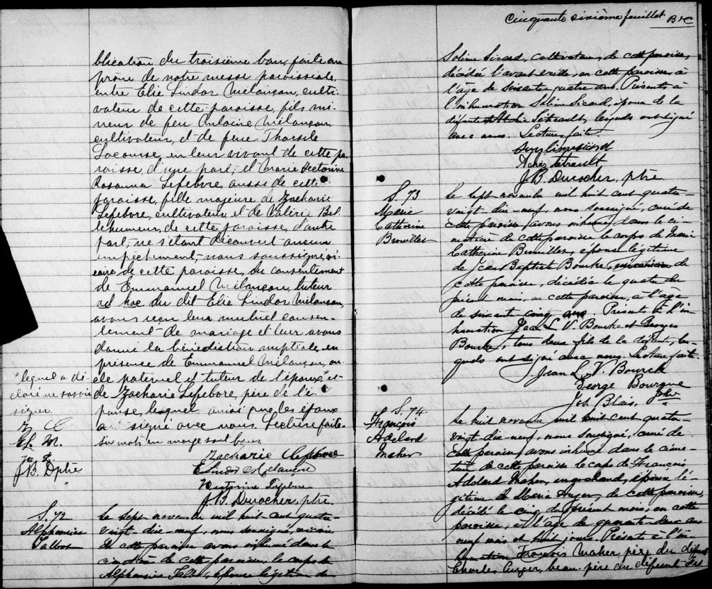 - Cette série regroupe les registres originaux de l'état civil, lesquels contiennent les enregistrements de baptêmes, de mariages et de sépultures consignés par le curé ou son représentant au cours de la période concernée par les documents.Outre les renseignements à caractère généalogique que nous pouvons y puiser, cette série peut constituer une source documentaire importante pour toute étude-statistique ou comparative sur les conditions de vie à différentes époques (mortalité infantile, espérance de vie) ou pour toute recherche portant sur l'occupation des terres (lieu de résidence), sur le mode de vie (métiers et professions, statut et âge des époux), sur les classes sociales (titres des parties impliquées, témoins/amis/parents présents lors d'un mariage), sur des évènements spéciaux (quelques mentions dans les sépultures) et sur des sujets à incidence médicale tels les maladies héréditaires (cause du décès)