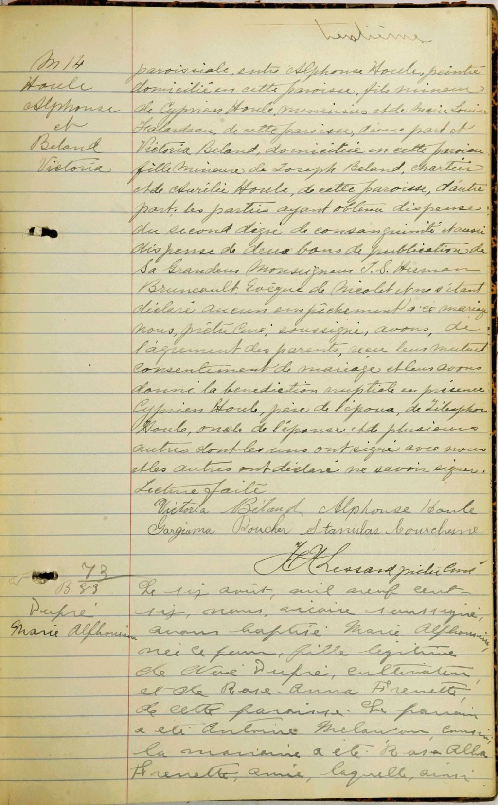 - Cette série regroupe les registres originaux de l'état civil, lesquels contiennent les enregistrements de baptêmes, de mariages et de sépultures consignés par le curé ou son représentant au cours de la période concernée par les documents.Outre les renseignements à caractère généalogique que nous pouvons y puiser, cette série peut constituer une source documentaire importante pour toute étude-statistique ou comparative sur les conditions de vie à différentes époques (mortalité infantile, espérance de vie) ou pour toute recherche portant sur l'occupation des terres (lieu de résidence), sur le mode de vie (métiers et professions, statut et âge des époux), sur les classes sociales (titres des parties impliquées, témoins/amis/parents présents lors d'un mariage), sur des évènements spéciaux (quelques mentions dans les sépultures) et sur des sujets à incidence médicale tels les maladies héréditaires (cause du décès)